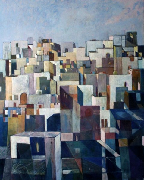 Une médina sinistrée et dévastée où les maisons sont renfermées, repliées et abandonnées après une bataille dure et acharnée. Les murailles ocre empêchaient son écoulement dans le seuil d’un vaste océan. La peinture rigoureuse et labyrinthique d’André nous enseigne que la lumière est derrière nous et pour la saisir, notre regard doit s’accoutumer à un monde clos, ascendant et symétrique.