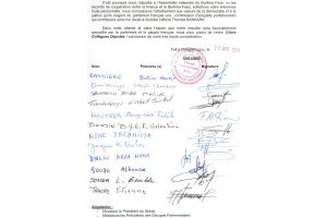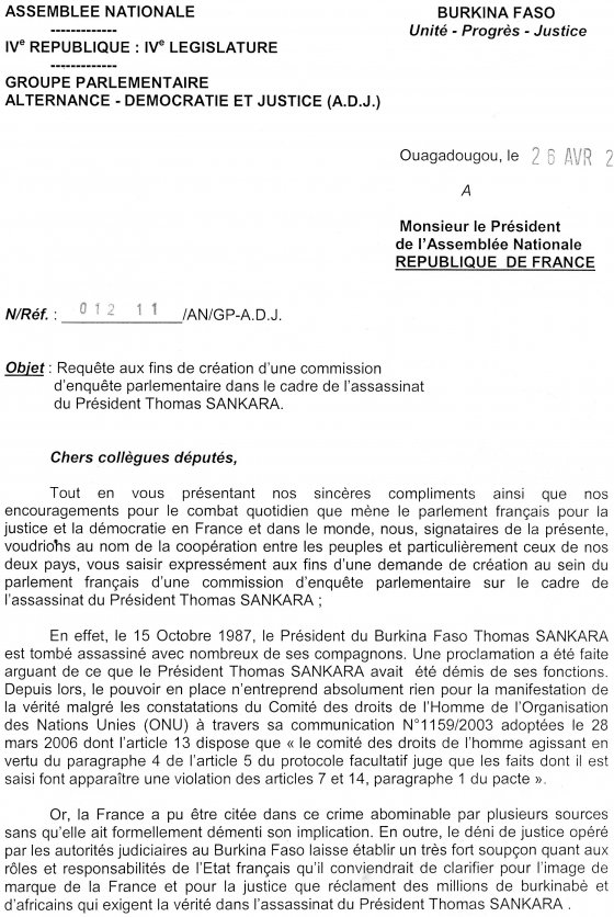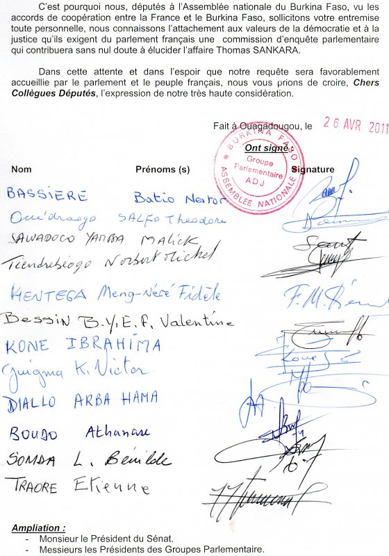 Cette lettre, datée du 26 avril 2011, sous l’égide du Chef de l’opposition, M. Benéwendé Sankara, Président de l’UNIR PS, mais aussi avocat de l’a famille Sankara, est signée par douze députés issus de différents partis.