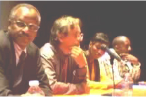 Etat des lieux et perspectives de réparations pour les rescapés : table ronde avec Yolande Mukagasana et des acteurs de la solidarité avec les rescapés du génocide : Tito Mugrefya, psychologue, fondateur de l’association Mpore ; Roland Junod, enseignant à l’école des Hautes études de Genève, fondateur de l’association Les amis de Bisesero ; Bruce Clarke, artiste plasticien, membre de l’association Appui-Rwanda.