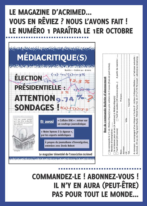 En octobre 2011, l’association de critique des médias, Acrimed, lancera, sur 32 pages et avec quelques couleurs, son tout nouveau magazine trimestriel : Médiacritique(s).