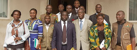 Image d’illustration : Dr N’Gouan Patrick, Coordonnateur National de la CSCI (en costume bleu) entouré de quelques membres du Bureau de Coordination et de l’équipe technique de la MOE (www.societecivile-csci.org)