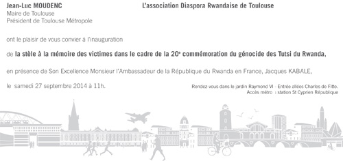 Une stèle en hommage au million de victimes du génocide perpétré contre les Tutsi en 1994 au Rwanda sera inaugurée dans la ville de Toulouse ce samedi 27 septembre 2014, à 11 heures, par Monsieur Jean- Luc Moudenc, Maire de Toulouse, en présence de S.E.M. Jacques Kabale, Ambassadeur de la République du Rwanda en France.