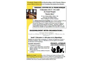 Ce mercredi 4 décembre, le tribunal citoyen de la Françafrique se tiendra de 18h à 22h au Grand Parquet, 35 rue d’Aubervilliers, M° Stalingrad ou Marx Dormoy, avec de nombreux témoignages et prises de paroles d’intervenants et de militants.