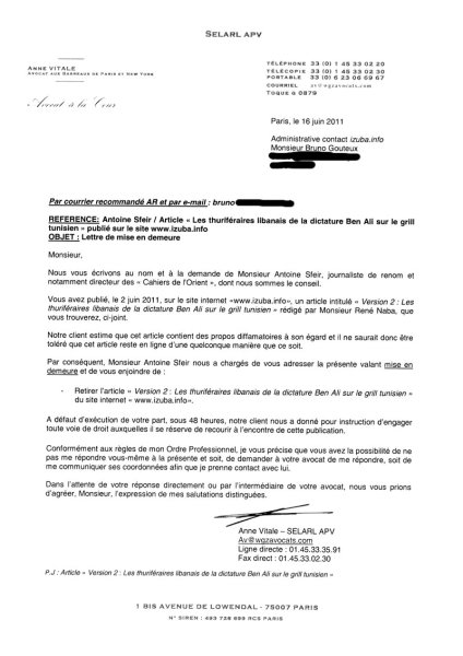 Parallèlement, suite à la parution de la « Version deux : Les thuriféraires libanais de Ben Ali sur le grill de la dictateur tunisienne », les sites renenaba.com, palestine-solidarite.org et oumma.com ont fait aussi l’objet d’un courrier analogue de la part du conseil d’Antoine Basbous pour la première version de ce texte.